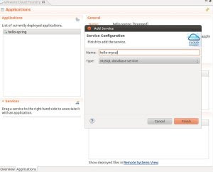 3. W sekcji Services klikamy w prawym górnym rogu na ikonę 'Add Service' i w nowym oknie wybieramy 'MySQL database service' i nazywamy go "hello-mysq". Klikamy 'Finish'.